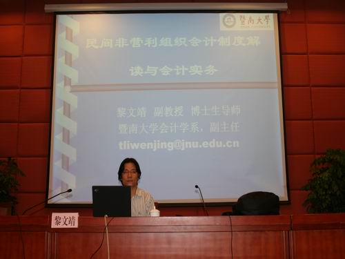 暨南大学会计系副教授、副主任、博士生导师黎文靖讲授《民间非营利组织会计制度》及相关政策法规解读和基金会会计实务、会计报表编制