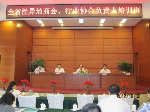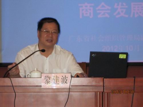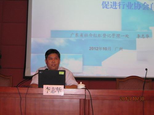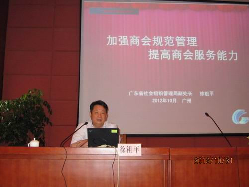 为贯彻落实《中共广东省委广东省人民政府关于进一步培育发展和规范管理社会组织的方案》(粤发〔2012〕7号)和《广东省民政厅关于进一步培育发展行业协会商会的实施意见》(粤民民〔2012〕105号),推进异地商会、行业协会规范建设,促进异地商会、行业协会健康有序发展,10月30日至31日,全省性异地商会、行业协会负责人培训班在广州举办。广东省社会组织管理局局长、省社会组织总会会长方向文,省社会组织管理局副局长、省社会组织总会执行会长黎建波,省社会组织管理局登记一处副处长徐祖平,总会常务副会长江黎明等出席培训班动员大会,全省性异地商会、行业协会负责人约160人参加了培训。