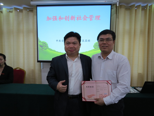 培训内容分为两部分:第一部分是井冈山斗争与井冈山精神(回顾井冈山革命历史和社会组织党的建设),由井冈山干部教育学院陈刚教授讲述;第二部分是十八大精神解读之社会管理创新(解读十八大精神的重点和社会组织人才队伍建设),由井冈山干部教育学院匡显桢教授讲解。学员们进行了热烈的讨论,两位教授就学员在学习中遇到的问题,做了耐心细致地解答。最后,李伟群副局长与匡显桢教授一起为学员颁发了结业证书。