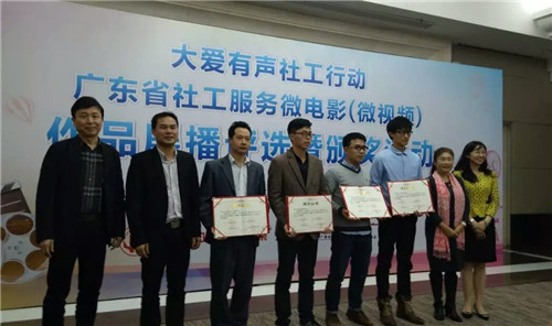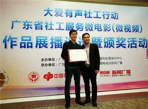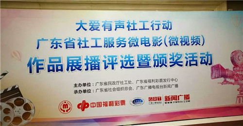 为宣传我省专业社会工作十年发展成就,宣传我省社工机构和社工师十年工作成绩,广东省民政厅社工处、广东省福利彩票发行中心、广东省社会组织总会、广东广播电视台新闻广播频率联合主办了“大爱有声社工行动 广东省社工服务微电影(微视频)作品展播评选暨颁奖活动”。