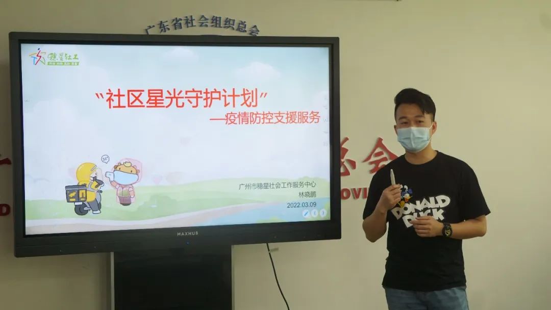 广州市穗星社会工作服务中心赤岗社工站主任林晓鹏进行了抗疫主题分享,以“社区星光守护计划”为例介绍了广州穗星开展的疫情防控支援服务