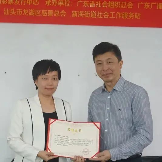 座谈会进入颁发荣誉证书的环节,由广东省福利彩票发行中心营销部副部长赵子力为汕头市龙湖区慈善总会、汕头市龙湖区新海街道社会工作服务站颁发荣誉证书;新海街道副主任陈瑞仪为广东省社会组织总会、广东广播电视台新闻广播频率、广东省社会组织评估中心颁发荣誉证书。