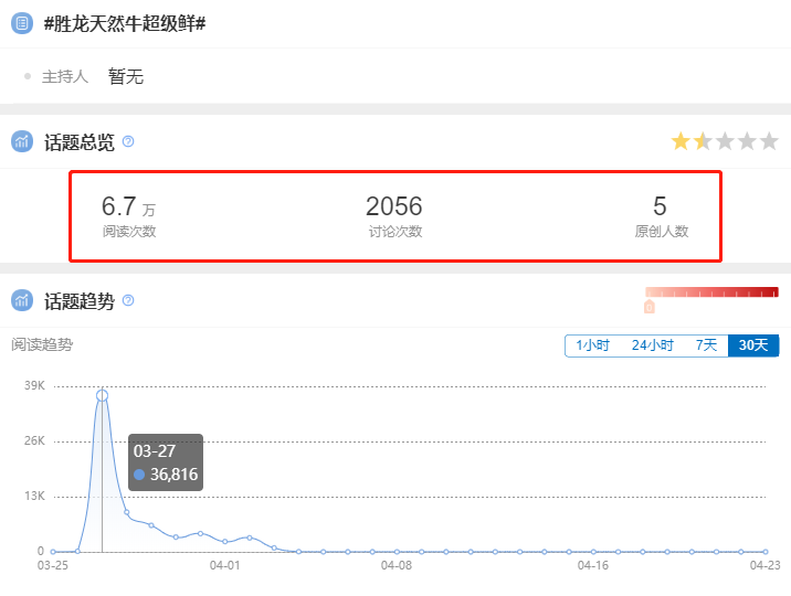 据统计,仅在 3 月 24 日 -3 月 28 日的话题营销活动期间,# 胜龙国货超级牛扒 # 话题总阅读为 12.4万 +,讨论次数为 4090 人次,原创人数为 6 人。其中 3 月 25 日是话题的波峰期间,话题阅读最高值可达8.79 万次。# 胜龙天然牛超级鲜 # 话题总阅读为 6.7万 +,讨论次数为 2056 人次,原创人数为 5 人。其中 3 月 27 日是话题的波峰期间,话题阅读最高值可达3.68 万次。
