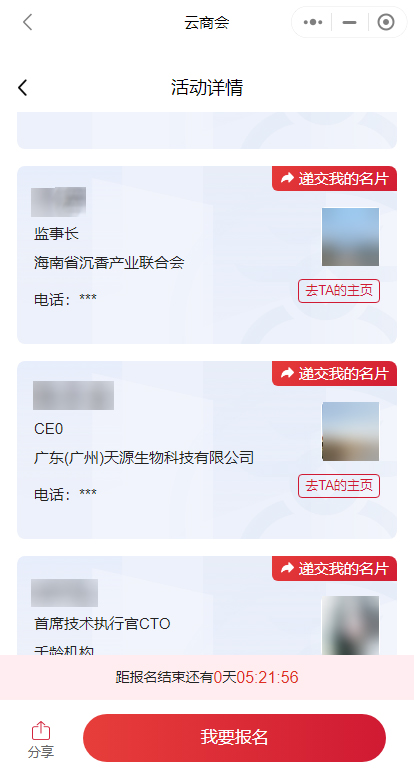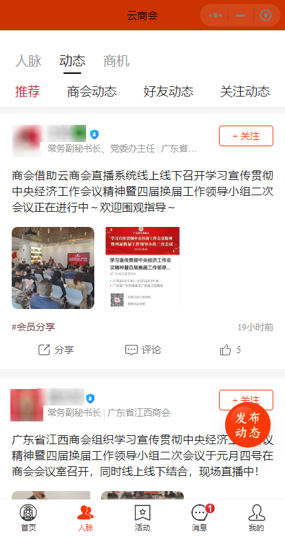 首先,创造线上交流场景。目前,无论是商协会秘书处人员,还是会员企业,都可以通过发布动态信息,在平台内这个庞大的“朋友圈”内,展示自身的动态信息(会内热点、企业能力等)。另外,会员企业也可能通过报名,参与平台内或商协会组织的线上/ 线下活动,拓宽社交场景。2022 年10 月,云商会平台更为此迭代上线了“名片墙”功能。使平台会员,在报名前能及时了解相碰会议出席的重要嘉宾及报名人员。同时,平台会员可以通过上传自身IP 名片或线上交换名片形式,互换名片并进行线上交流,为商务人脉的建立提供更多场景化便利。