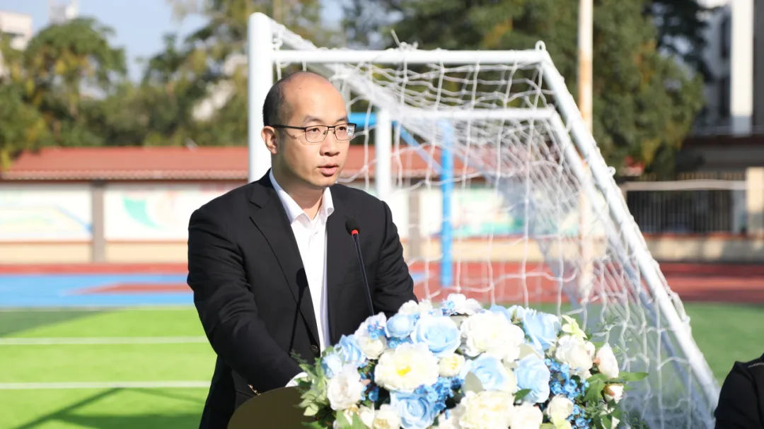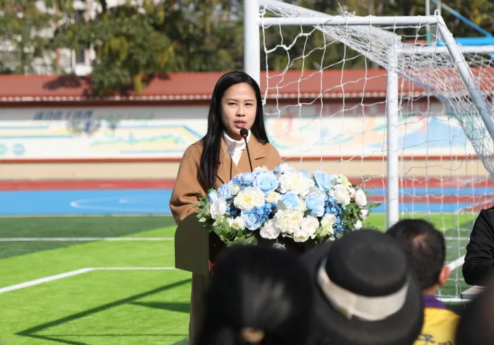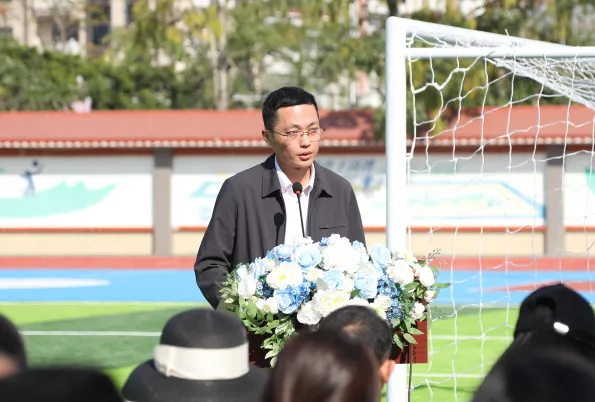 广东省社会组织总会副秘书长赵俊欣在讲话中祝贺工程竣工,并向关心支持乡村教育的各级政府、公益伙伴、施工单位及全校师生致谢;提及为解决学校原有运动场不足问题,联动广东省和的慈善基金会投入24万元改造跑道、篮球场,建设聚焦安全耐用实用;强调项目落地需多方协作,寄语学生爱护场地、强体魄磨意志、以感恩回报社会,同时表态总会将持续联动爱心力量助力乡村建设教育,祝愿王村港镇借乡村振兴与 “百千万工程” 蓬勃发展。