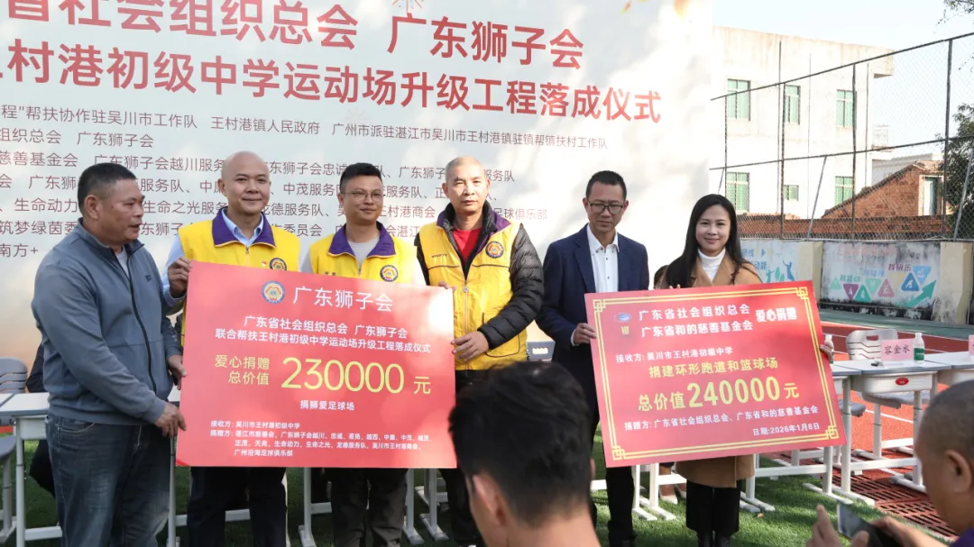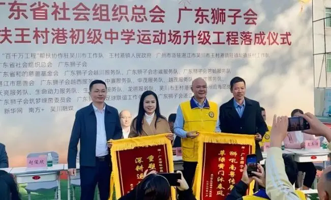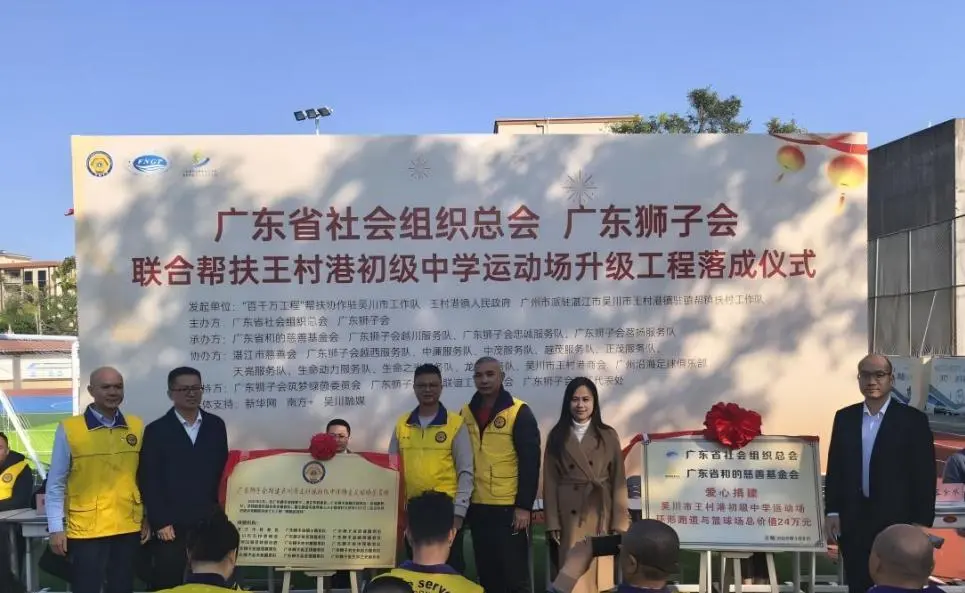 2026年1月8日,由广东省社会组织总会、广东狮子会主办,广东省和的慈善基金会等承办,湛江市慈善会等协办的王村港初级中学运动场升级工程落成仪式在吴川市顺利举办。吴川市委副书记叶敏亮,王村港党委书记吴国荣,广东省社会组织总会副秘书长赵俊欣,王村港初级中学校长张景保,广东狮子会越川服务队队长杨霖等出席仪式。